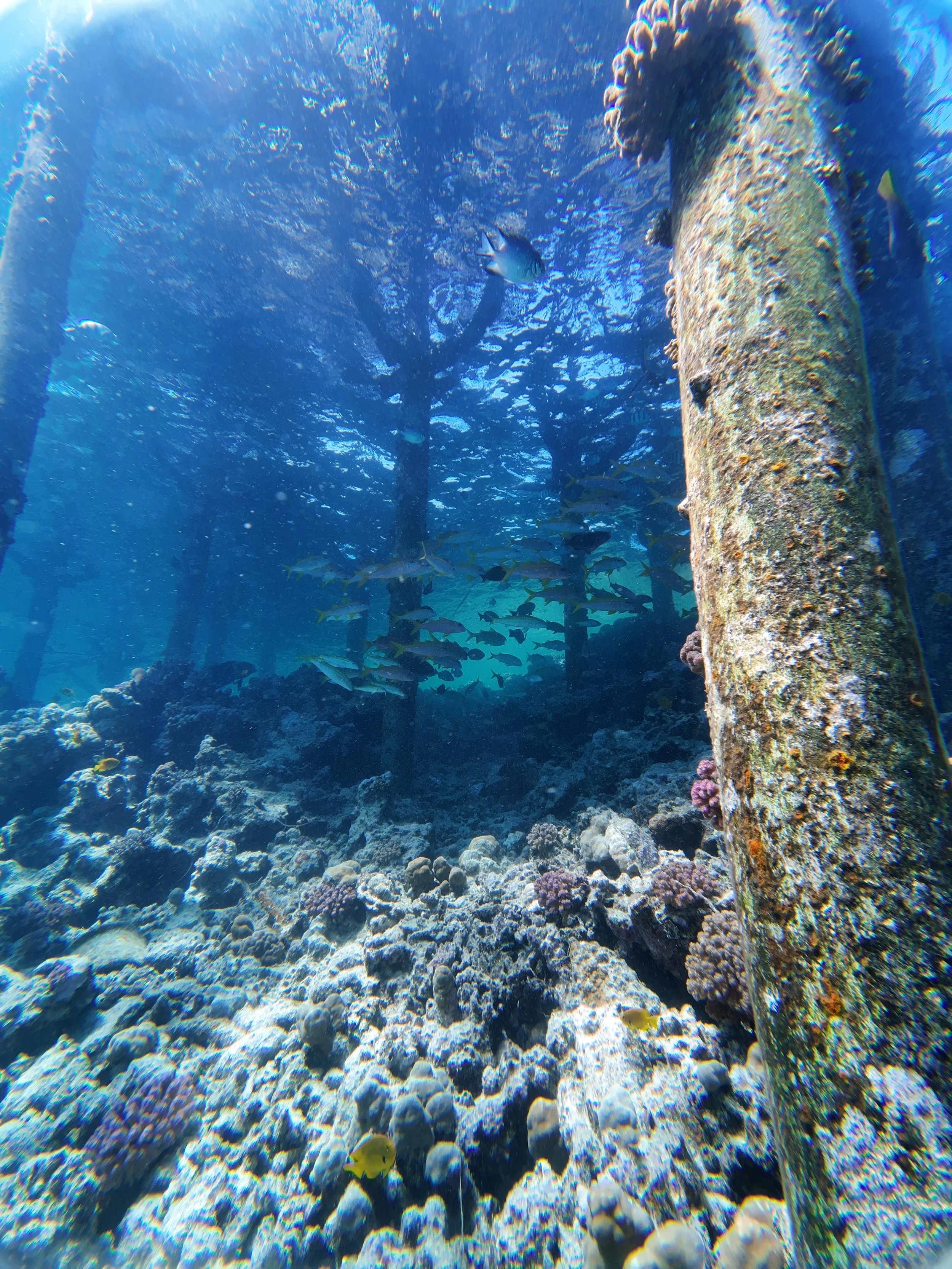 A gem of a shore-accessible house reef in Makadi Bay. Walk in from the beach, descend over a sloping garden, and find a thriving coral wall ten metres from your towel.